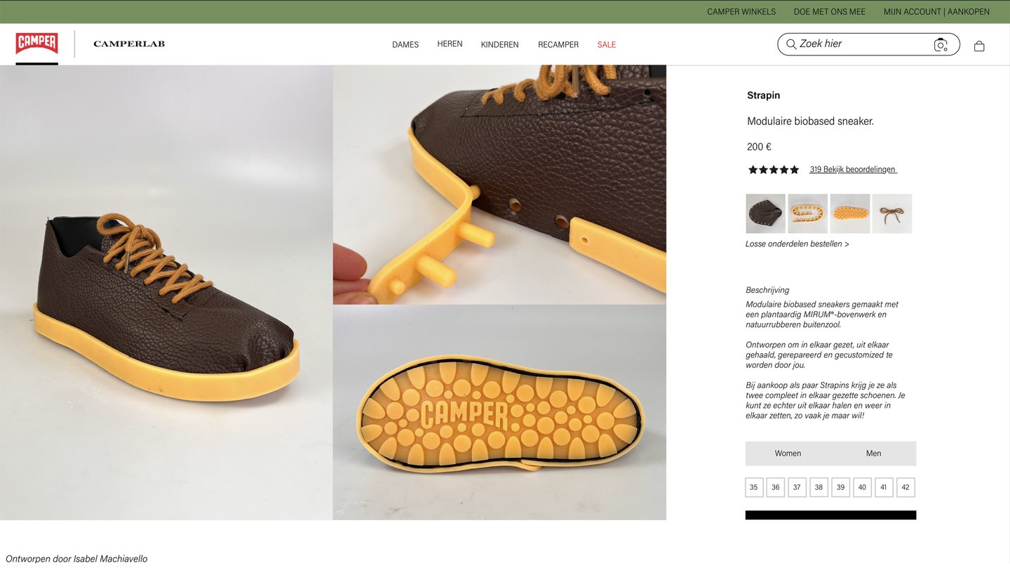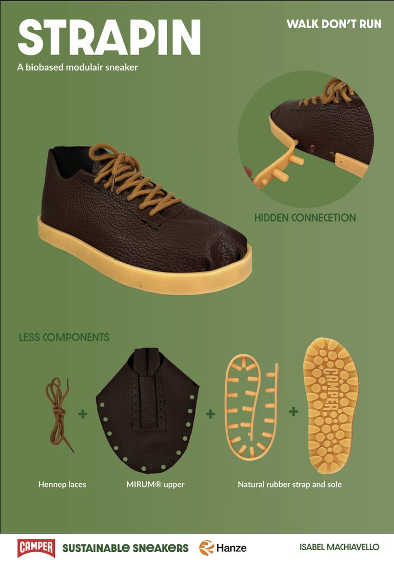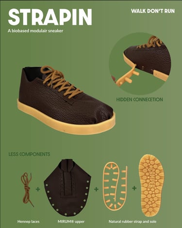 De Strapin een modulaire, biobased sneaker. Het ontwerp bestaat uit een upper van MIRUM®, een plantaardig alternatief voor leer dat is opgebouwd uit natuurlijk rubber, plantaardige vezels, oliën en wassen. Een natuurrubberen zool en hennep veters.