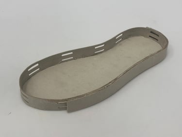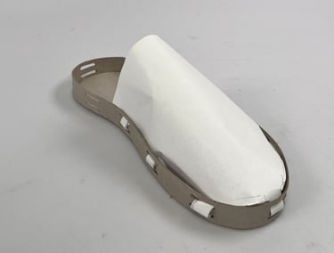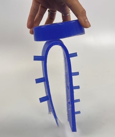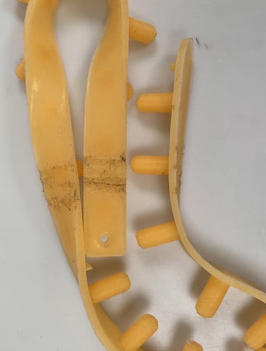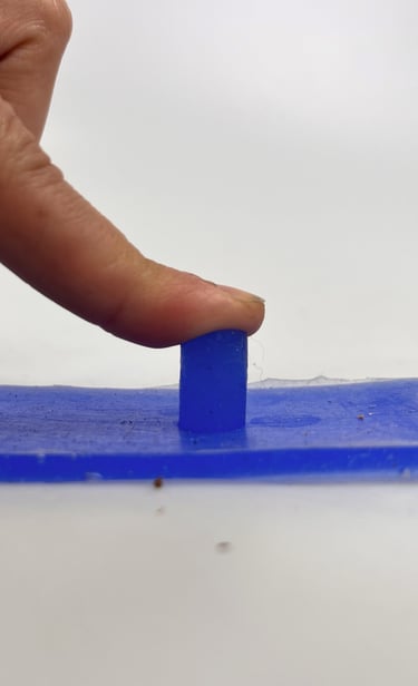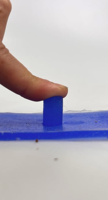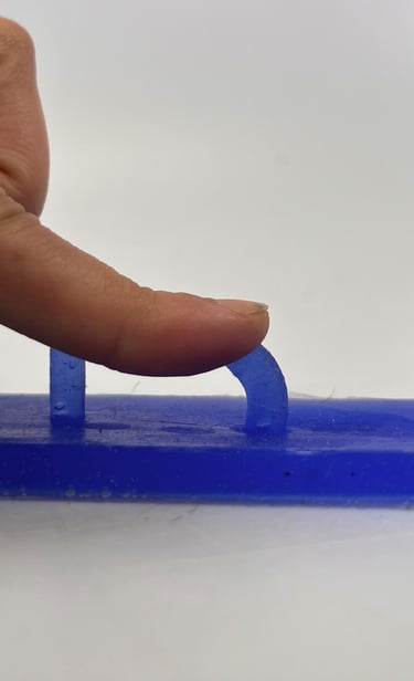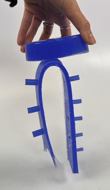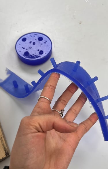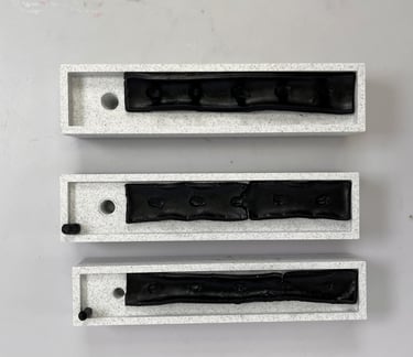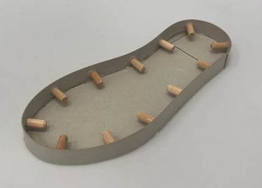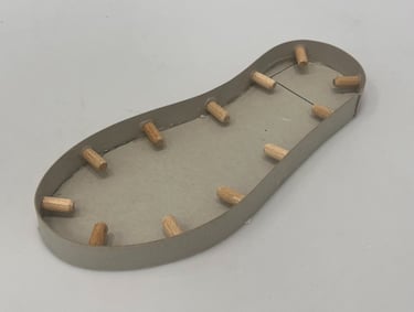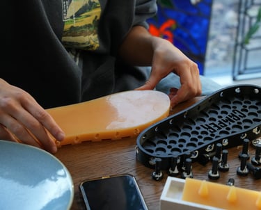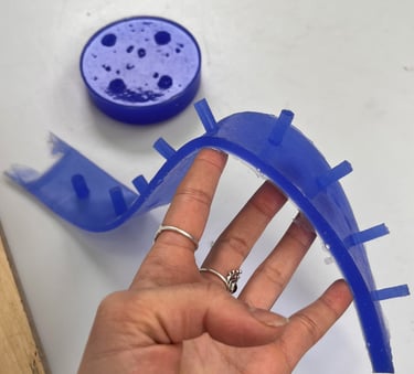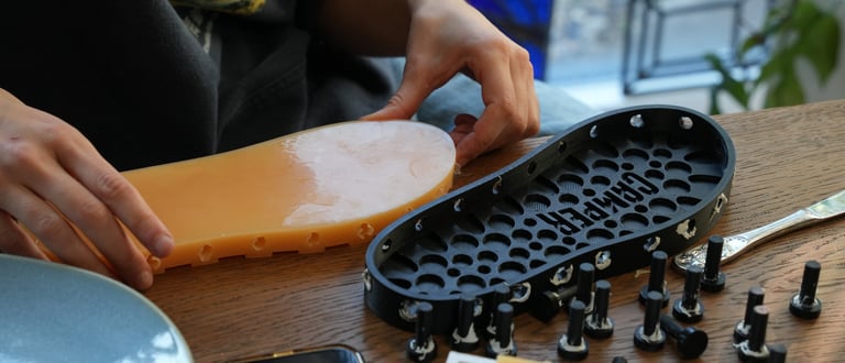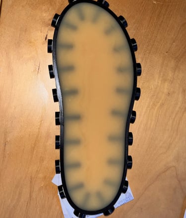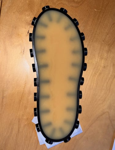 Het model van de zool is gemaakt met silicone. Deze is gegoten in een 3D geprinte mal. Om te voorkomen dat er absoluut geen lekkage kwam rondom de pinnen, is er een kleef middel tussen gestopt voor het gieten.