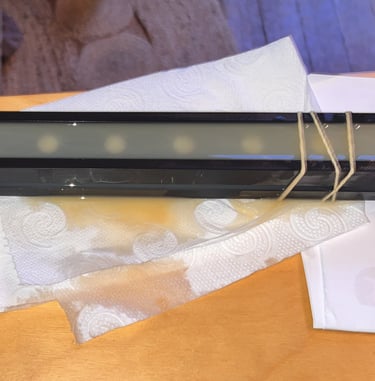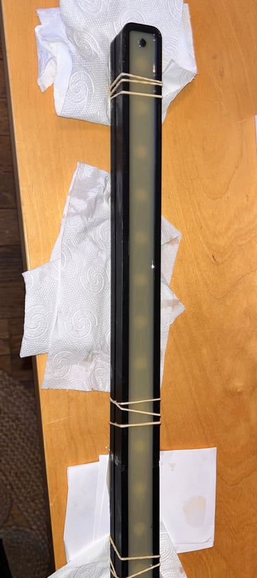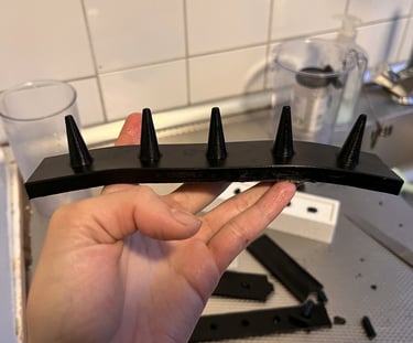 Deze strip ging niet goed. De mal was lossend gemaakt zodat je de pinnen er gemakkelijk uit kon drukken. Hierdoor zal de mal niet strak genoeg en begon de silicone overal doorheen te lekken. Met elastiekjes is geprobeerd de mal strakker te maken, alleen zorgde dit voor plekken die nat bleven. Na 1,5 week waren de plekken waar elastiekjes hadden gezeten nog steeds niet droog, dit hoort in 6 uur volledig uit gehard te worden.