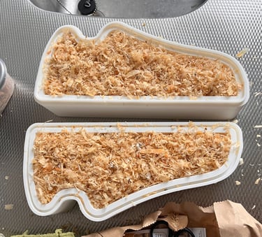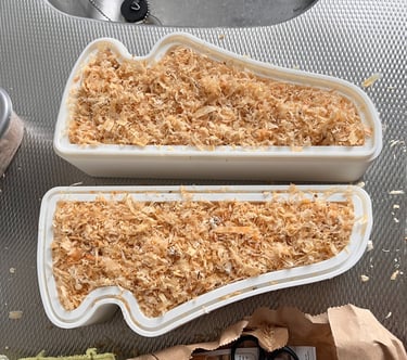Voor de testen met mycelium zijn gekozen voor 2 verschillende subtraten: stro en karton. Beide subtraten moet je eerst koken om het te pasteuriseren. Je mallen en werktafel maak je schoon met een ontsmettingsalcohol, om alle bacteriën en schimmelsporen te doden voordat je het mycelium broed toevoegd. Nadat het subtraat is afgekoeld en alles schoon is kan je broed mengen met de subtraten.