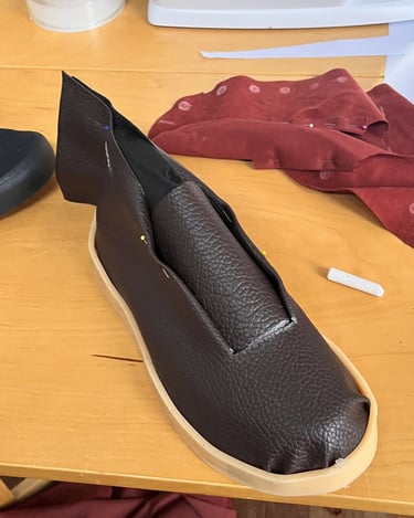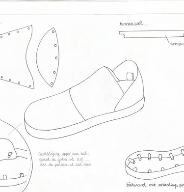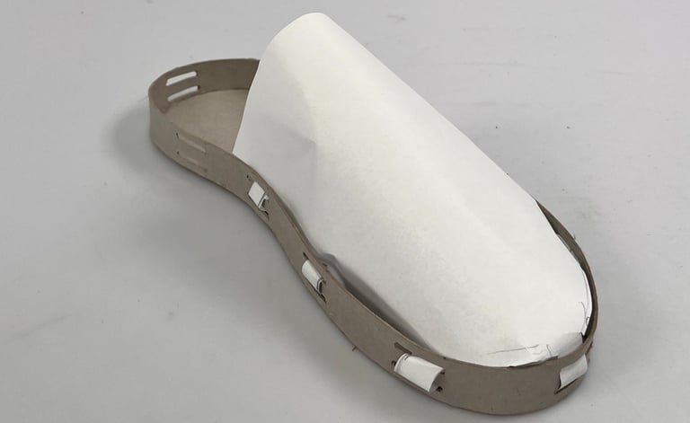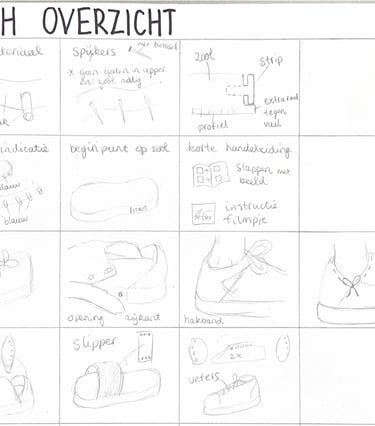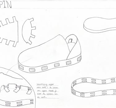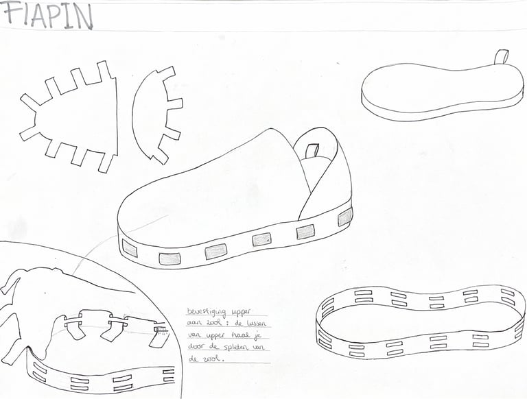 Verschillende testen gedaan hoe je uit 1 stuk stof de upper kan maken. Hoe de verschillende manieren van vouwen zorgen voor verschillende sluitingen. Bijvoorbeeld dat je via de achterkant in je sneaker kan stappen, waarna je hem sluit. Ook heb ik gekeken hoe je aanpasbaarheid toe kan voegen.