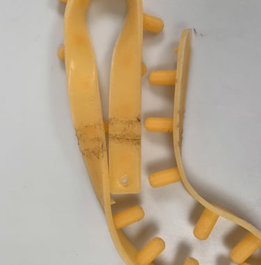 De pinnen van de strip braken in de bochten redelijk snel af. Dit was met name bij de neus en hak doordat ze in een scherpe hoek in de zool moeten. Dit werkte niet omdat ze van een hard materiaal waren gemaakt. Hierdoor buigen ze niet mee en komt er dus veel spanning op de montage plek. Met een kortere lengte pin ging het al beter, maar bleef het probleem aanwezig. Dit zou voorkomen kunnen worden met een flexibeler materiaal of een andere verbinding.