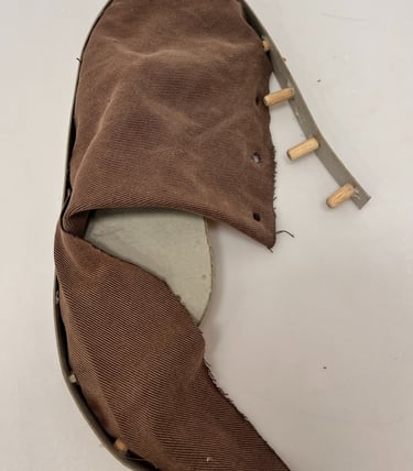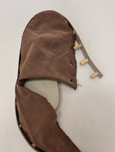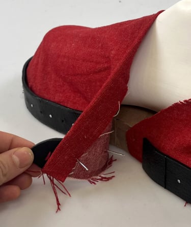 Aan de Bands zool was de upper lastig te bevestigen, door de extrastrip die de verbinding verborg. Het lukt niet om de stof door zo’n smalle ruimte te geleiden. Hier besloot ik het nog te testen zonder de extra strip, of de verbinding subtiel genoeg was.
