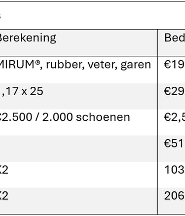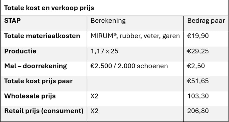 Er is een kostprijs indicatie gemaakt voor een paar Strapin sneakers. Hierbij is gekeken naar naar patroonefficiëntie, zo kan uit één vierkante meter MIRUM® twaalf uppers worden gesneden. Ook zijn materiaalvolumes, productietijd en assemblage per schoen meegenomen.