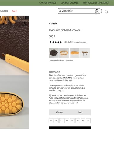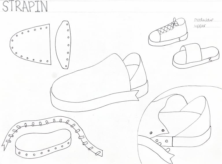Tijdens een winkelbezoek aan Camper kwam naar voren dat de Roku (Campers bestaande modulaire sneaker) door veel consumenten als te extreem wordt ervaren. Klanten kiezen vaker voor een visueel veiligere sneaker. Dit inzicht vormde het startpunt voor de Strapin: een repareerbare sneaker waarbij de techniek verborgen is.