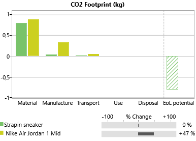 De biobased Strapin sneaker heeft over de volledige LCA een vrijwel CO₂-neutrale footprint dankzij hergebruik op end-of-life. In vergelijking met een Nike Air Jordan Mid 1 is de materiaaluitstoot vergelijkbaar, maar wordt de totale impact sterk verlaagd door demontage, hergebruik en biobased materialen. De natuurlijke rubberen zool is het grootste verbeterpunt, terwijl de MIRUM® upper en het ontbreken van microplasticvervuiling duidelijke milieuvoordelen bieden.