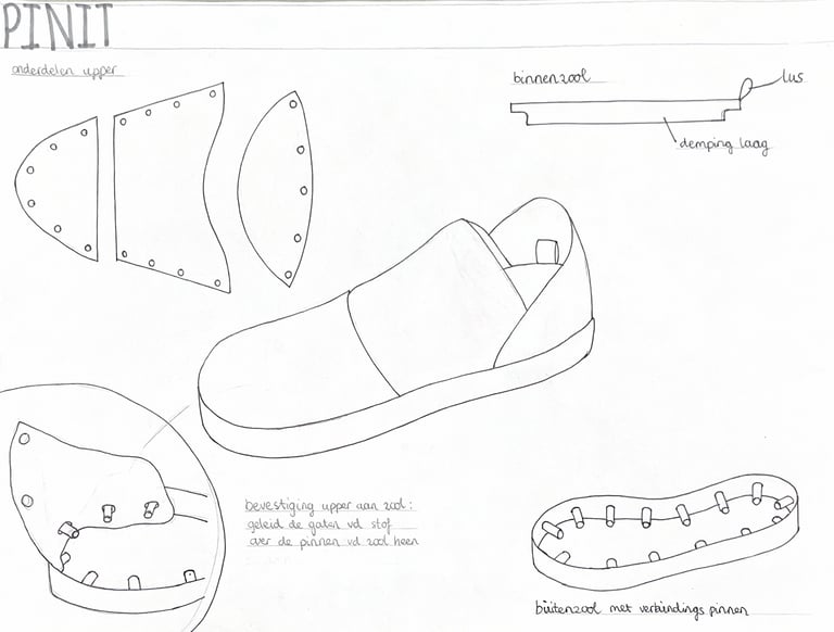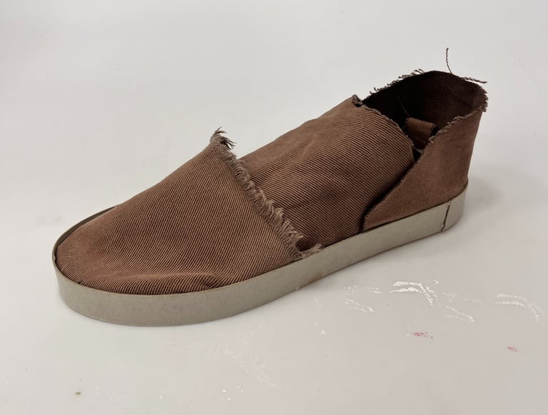 De Flaps zool werkte niet heel goed met het bevestigen van een upper. De flappen zijn erg lang waardoor je ze lastig door de stof krijgt. Het zou wel redelijk goed produceerbaar zijn.