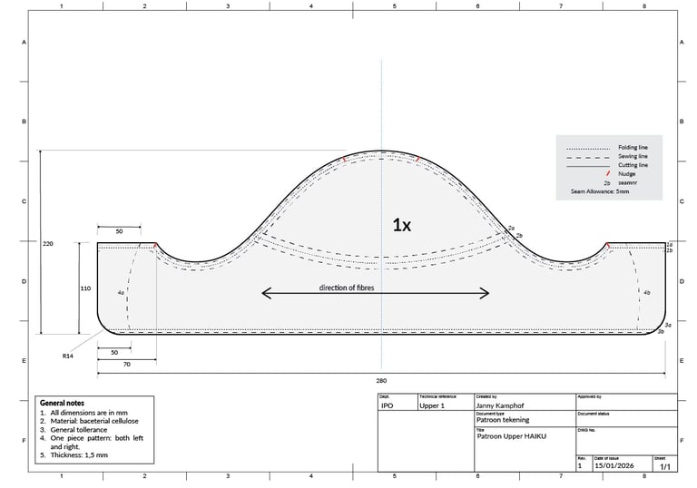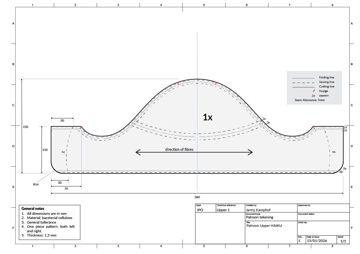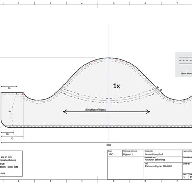 Al deze inzichten zijn omgezet naar een patroon die gebruikt kan worden om de upper te produceren. Rekening houdend met: seam allowance, welke naden aan elkaar gestikt moeten worden, nudges en symetrie.