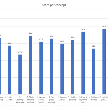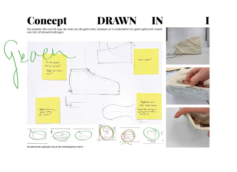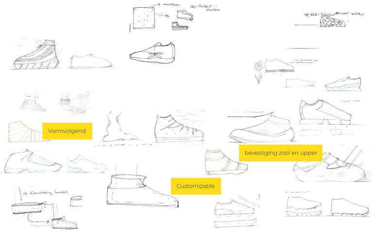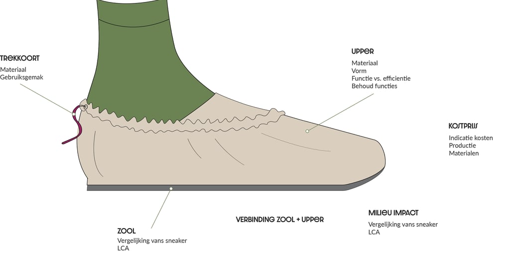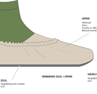 Per onderdeel is gekeken naar materiaalkeuze, vorm en behoud van functies. Daarnaast is de kostprijs meegenomen en is de milieu-impact vergeleken met die van een bestaande sneaker aan de hand van een LCA. Deze uitwerking onderbouwt de gemaakte ontwerpkeuzes en vormt de basis voor de verdere technische uitwerking van het ontwerp.