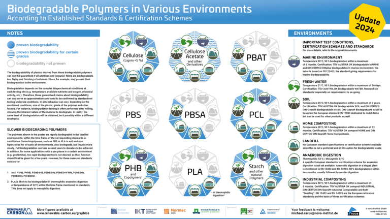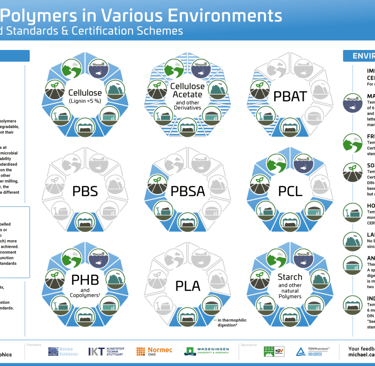 Polyhydroxyalkoanaten is een groep polymeren dat zowel biogebasseerd is als biologisch afbreekbaar onder iedere omstandigheid. Zie het overzicht hieronder van het nova instituut.
