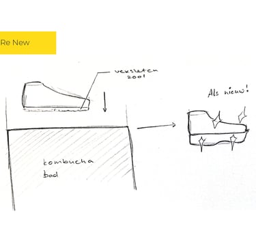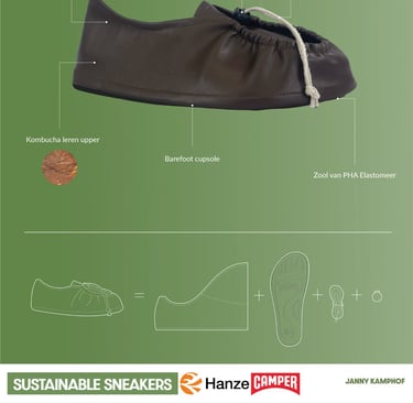De sneaker is gemaakt van kombucha leer, een bacteriële cellulose. Door de versleten schoen in een bad van kombucha thee en culturen onder te dompelen, vormen de bacteriën en gisten een nieuwe laag om de schoen.