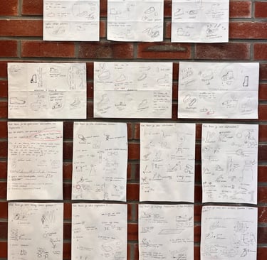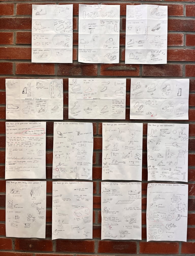 Allereerst zijn er in groepsverband verschillende ideation-technieken toegepast, om vrij en creatief mogelijke oplossingsrichtingen te verkennen. Daarna is er individueel verder gegaan met een ideeënmatrix met verschillende onderwerpen: verbindingen, ontwerprichting en thema. Hieruit kwamen de eerste ideeschetsen.