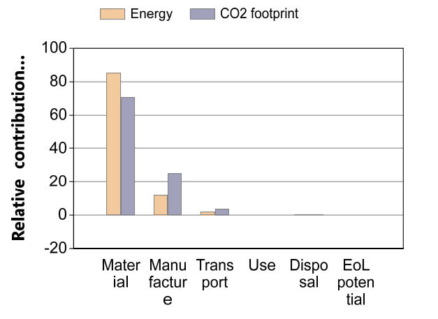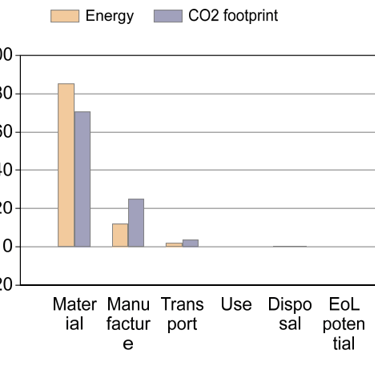 Zoals weergegeven in figuur (...) is het materiaal de grootste verbruiker van energie en heeft het de grootste co2 voetprint. Concluderend dat op het gebied van materiaal dus de grootste stappen te zetten zijn in het ontwerp.