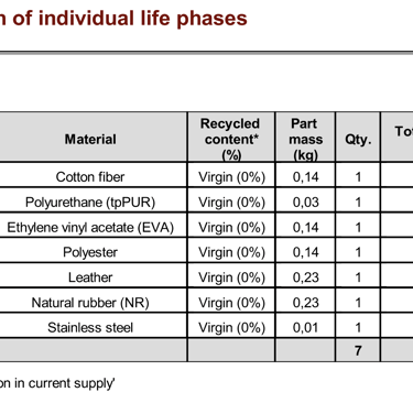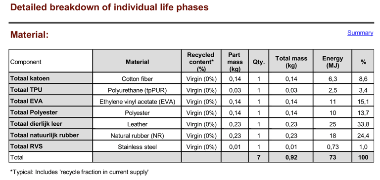 Verder blijkt uit de analyse dat dierlijk leer (33,8%) en natuurlijk rubber (24,4%) samen verantwoordelijk zijn voor meer dan de helft (58,2%) van de totale energieconsumptie (73 MJ). Dit zijn daarmee de meest energie-intensieve materialen en bieden daarom de grootste kans op een verlaging van de totale milieu-impact.