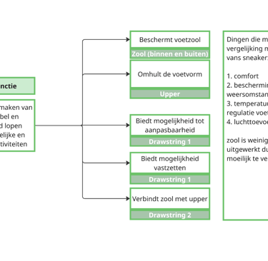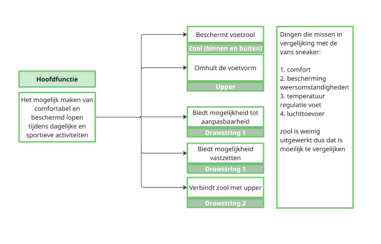 Naast de sneakeranalyse is er ook een functieanalyse uitgevoerd op de sneaker. Dit is gedaan in de vorm van een functieboom. Deze functieboom kan als tool gebruikt worden om het herontwerp van de sneaker te valideren.