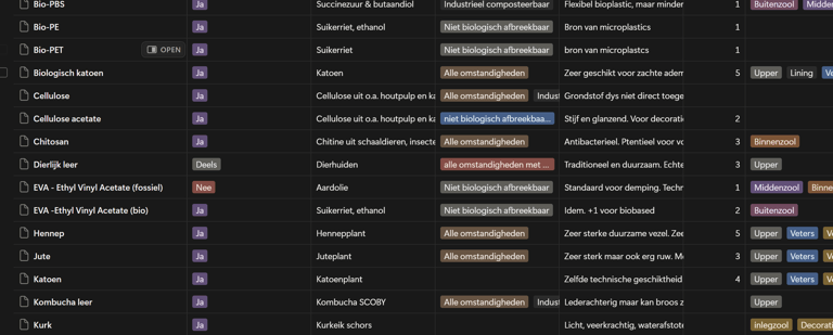 Om een overzicht te creeëren van bestaande materialen, is er een database opgezet met verschillende filtermogelijkheden: mata van biodegradeerbaarheid, biobased, geschikt voor welke functie of onderdeel vaan een sneaker, etc.