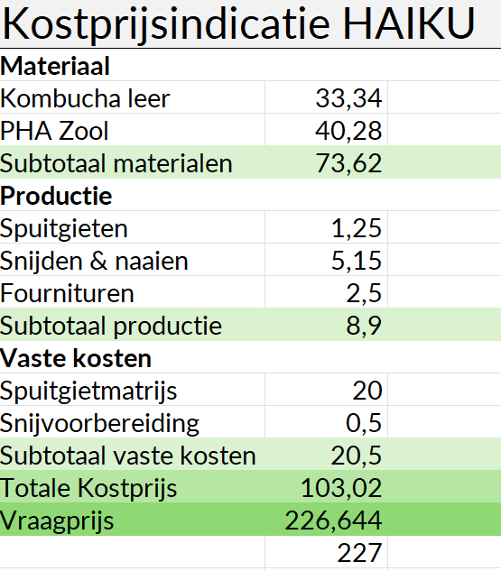 De volgende indicatie is gemaakt voor de kostprijs van HAIKU. De vraagprijs is relatief hoog in vergelijking met de andere sneakers van Sustainable Sneakers. Echter zijn zowel het materiaal van de zool als van de upper nog in de ontwikkelingsfase en zullen de materiaalkosten naar verwachting afnemen in de toekomst.