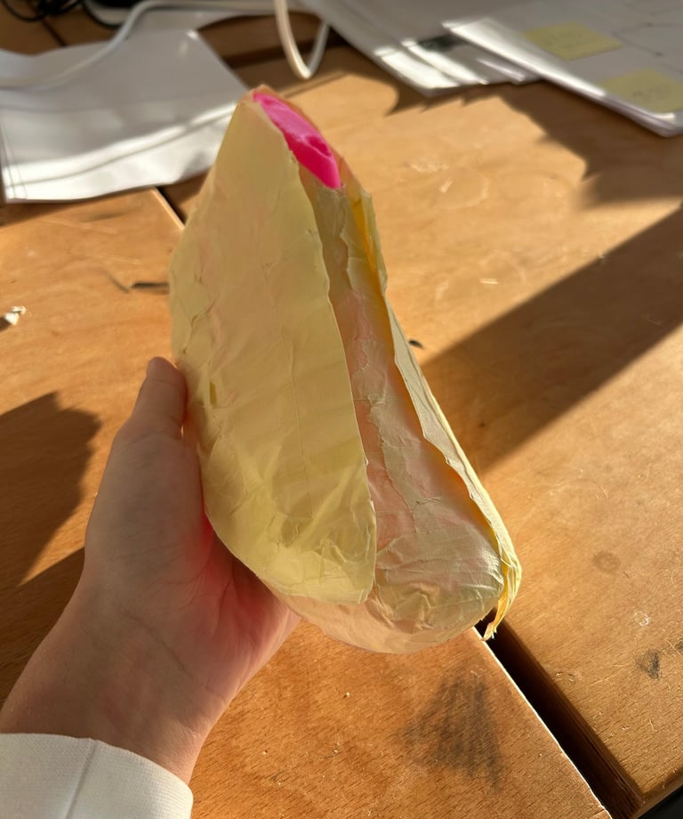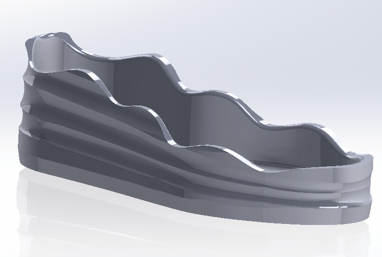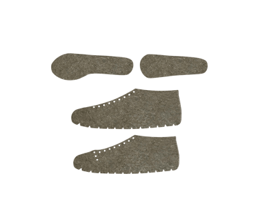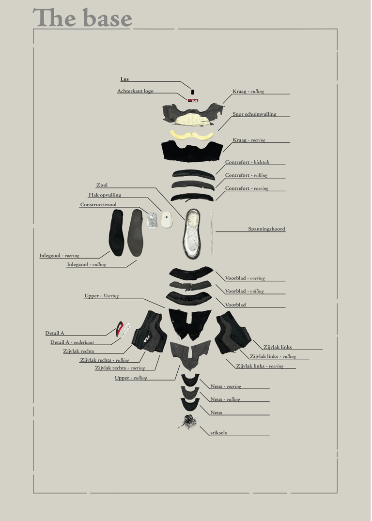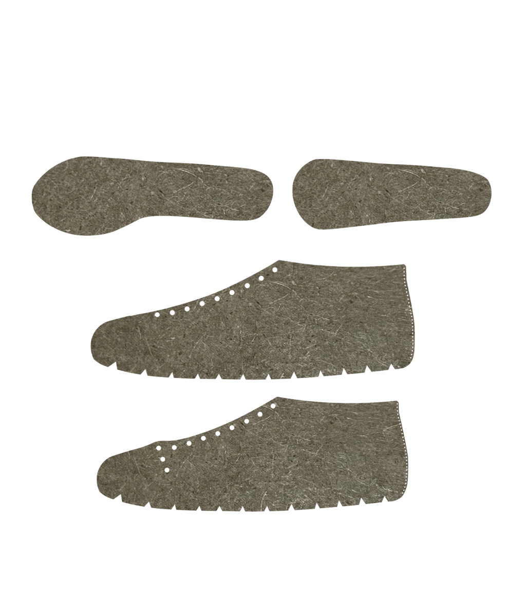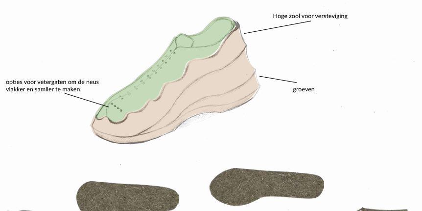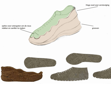 Het uiteindelijke patroon maakt gebruik van stansen als productiemethode, hierin zijn ook notches langs de onderkant van de zijpanelen meegenomen zodat deze rondom de zool kunnen draaien en zonder ophoping van materiaal aan de zool bevestigd kunnen worden.
