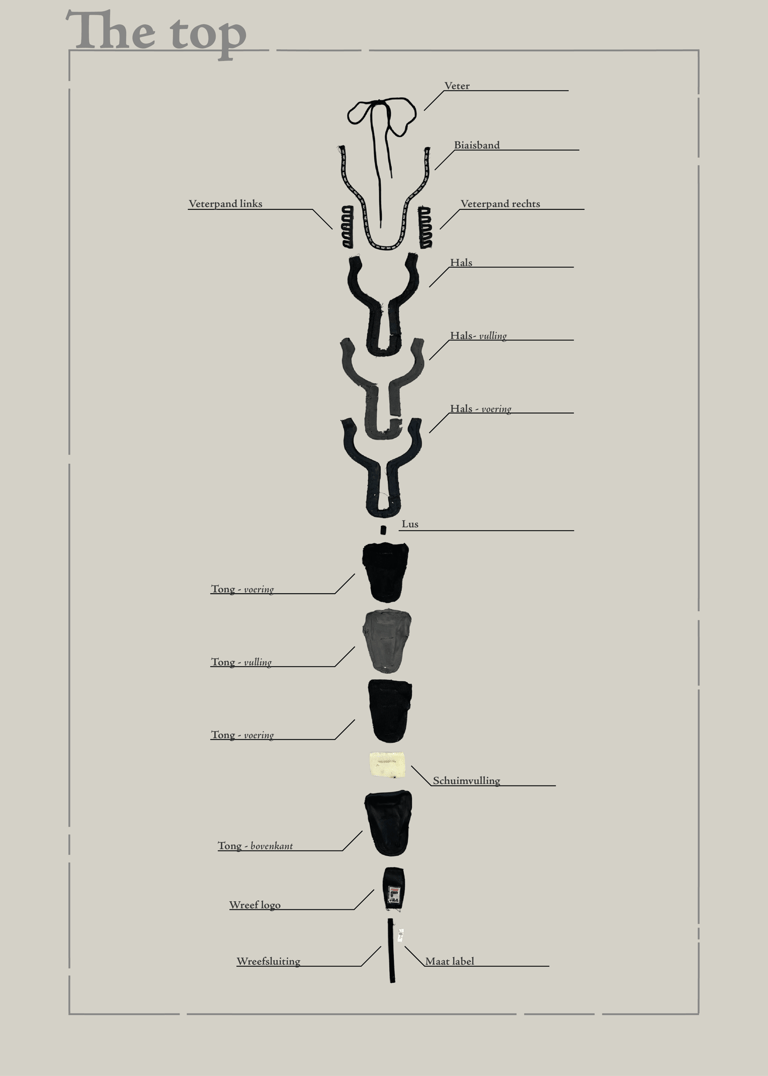 In het begin van de oriëntatiefase heeft elk teamlid een sneaker uit elkaar gehaald om een beter beeld te krijgen van de opbouw van huidige sneakers en de problematiek er achter. Dit gaf ook meteen nuttige inzichten voor de debriefing en vormde een uitgangspunt voor het eerste PvE