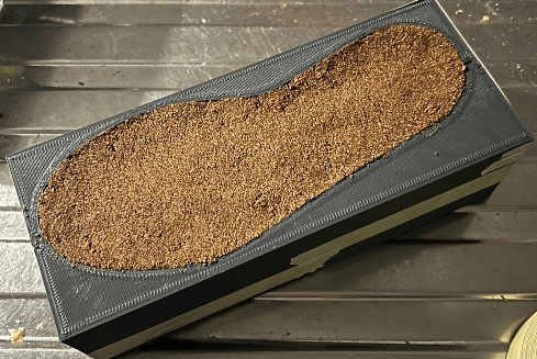 Het materiaal wordt vanaf de bovenkant in de mal geperst en wanneer deze is uitgehard gaan eerst de buitenste 2 delen van de mal open met de lengte van de zool als deellijn, daarna word de zool van het middelste deel afgehaald zodat er een holte overblijft in het midden waar de upper in gezet kan worden.